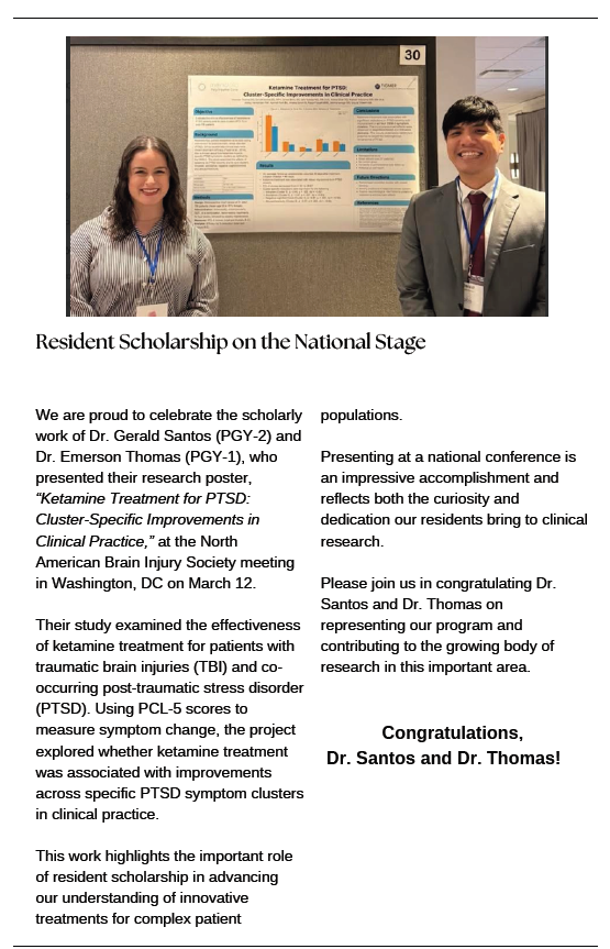 In collaboration with TIGMER, Mendala PolyTrauma Clinic presented “Ketamine Treatment for PTSD: Cluster-Specific Improvements in Clinical Practice” at the North American Brain Injury Society meeting in Washington DC on March 12, 2026.
